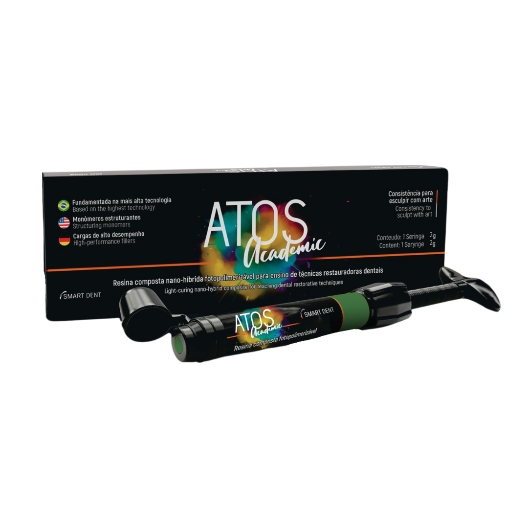 ATOS ACADEMIC é uma resina composta nano-híbrida fotopolomerizável para ensino de técnicas restauradoras dentais.